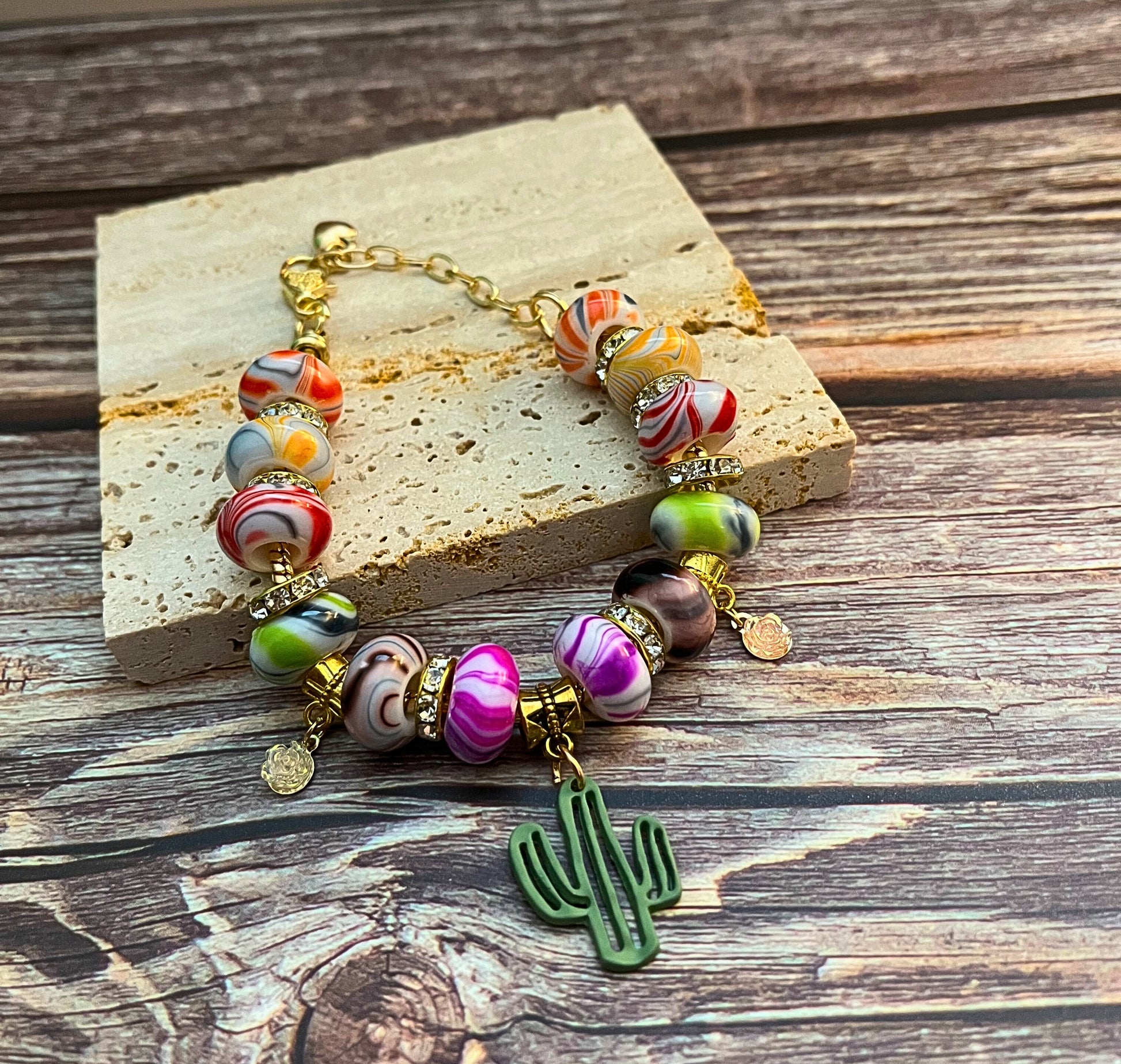 Capture the vibrant beauty of the desert sunset with our Arizona Skyline Bracelet. Inspired by the swirling colors of Arizona’s breathtaking landscapes, this handcrafted charm bracelet features a stunning array of multicolored glass beads in rich hues of red, orange, green, pink, and purple—each one unique, just like the skyline at dusk.