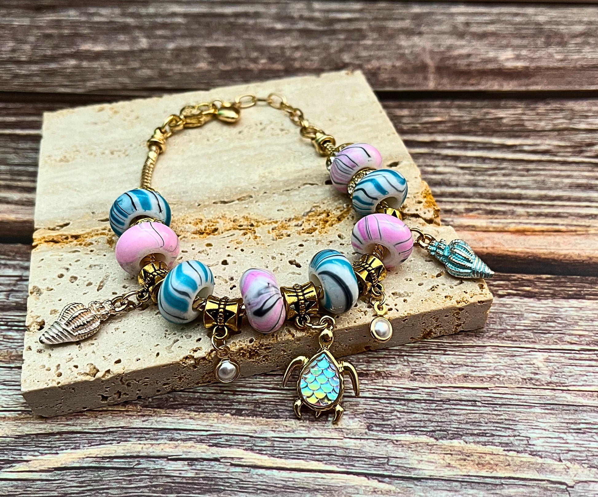 Dive into a world of coastal color with our Ocean Bloom Charm Bracelet, a handcrafted piece that captures the beauty of ocean tides and blooming shores. This playful yet elegant bracelet features a delightful mix of pink and blue marbled glass beads, accented by gold-tone charms that dance with every movement.